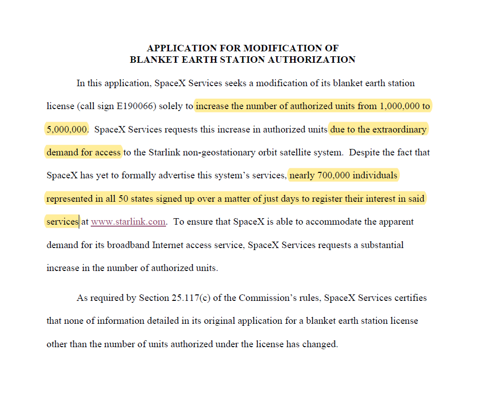 조금 더 자세히 말하면 아무런 광고를 하지 않았지만 50개주에서 70만명에 달하는 사람들이 스타링크 서비스에 관심을 두고 등록했다고 합니다. 그래서 스타링크 단말기 수를 100만개에서 500만개로 늘리기 위해 다시 허가서를 제출한 것입니다.