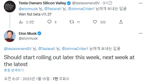 3. FSD v11.3 이 잘 준비되고 있는 것으로 보이며, 일론은 이번주 주말 혹은 늦어도 다음주에 배포될 것이라고 말했습니다.