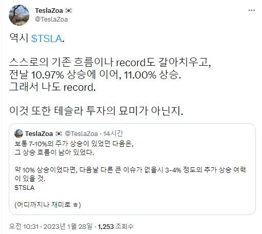 그런데 금요일에도 11% 상승을 했네요. 테슬라 스스로의 흐름과 기록도 갱신해버리네요.