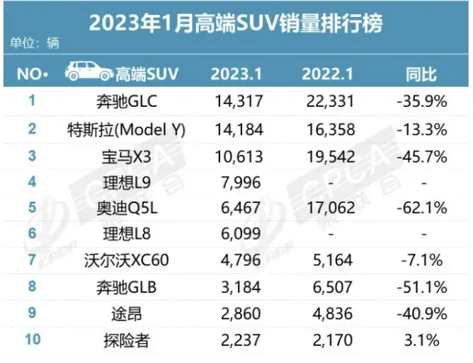 4. 모델Y는 중국에서 1월 프리미엄 SUV 판매량 2위를 차지했습니다.