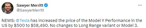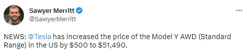 6. 테슬라는 미국에서 모델Y SR 가격을 $51,490, Pf를 $58,490으로 각각 $500 인상했습니다.