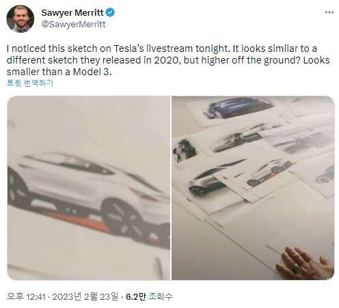 2. 테슬라의 라이브 스트림(Engineering HQ)에서 발견된 스케치인데, 모델3보다 작은 디자인이라고 합니다.
