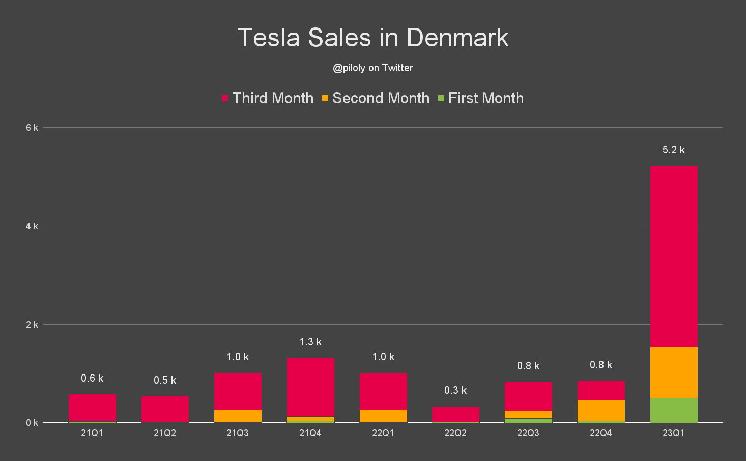 “Tesla sold more cars last month in 🇩🇰 than it did in all of 2022! The Tesla Model Y became the best-selling Danish vehicle in a month of all time: 🥇Model Y (March '23): 3,203 🥈Ford Kuga (July '20): 1,688 🥉VW Up! (Nov. '12): 1,642 Model Y