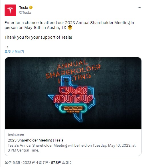 1. 2023 테슬라 연례 주주총회는 5월 16일, 텍사스 오스틴에서 열릴 예정입니다.