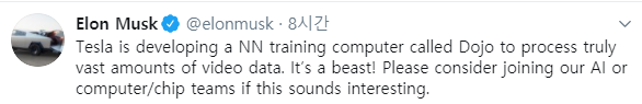 1. 머스크는 트윗에서 ai/컴퓨터 칩 팀 멤버를 고용해서 Dojo라 불리는 뉴럴 네트워크(NN) 컴퓨터를 개발할 예정이라고 말했습니다. Dojo는 방대한 양의 비디오 데이터를 처리할 수 있는 슈퍼 컴퓨터입니다.