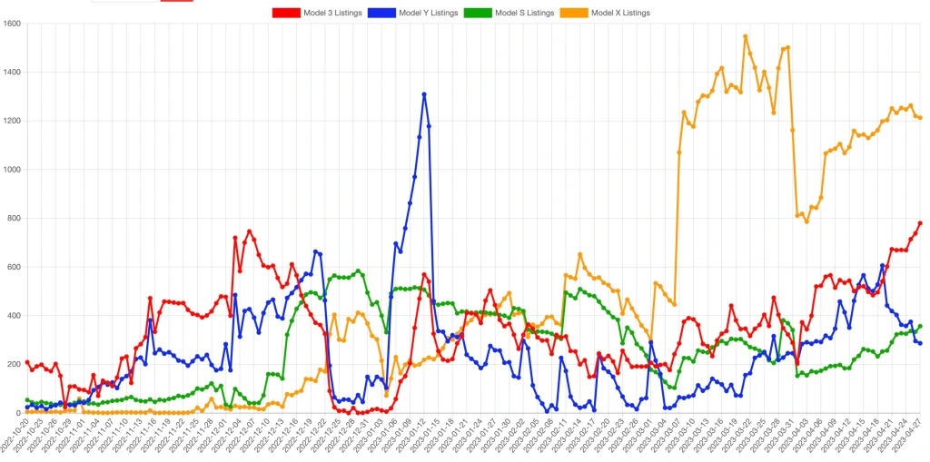4. 미국에서의 테슬라 차량 재고 상황을 나타내는 그래프입니다.
