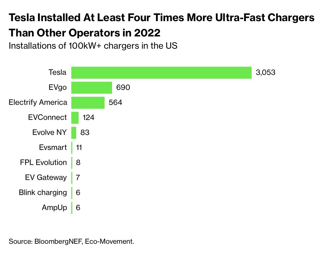 3. 2022년 테슬라가 다른 사업자들보다 4.4배 더 많은 초고속 EV 충전기를 설치했다고 합니다.