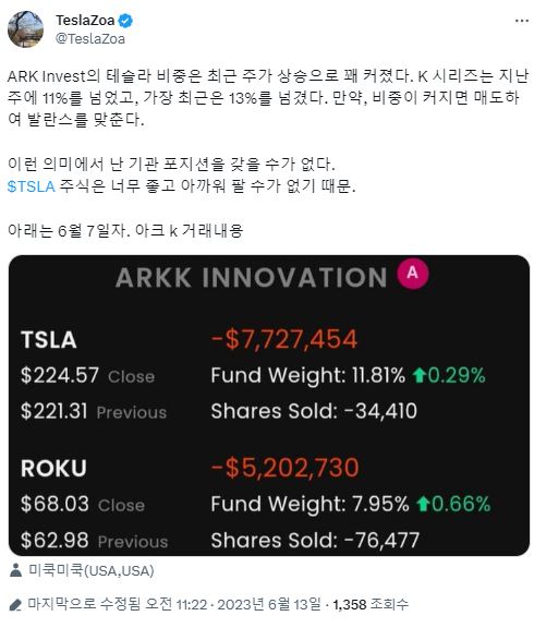 4. ARK Invest의 테슬라 비중은 최근 주가 상승으로 꽤 커졌습니다. 그 중 K 시리즈는 지난 주에 11%를 넘었고, 가장 최근은 13%를 넘겼습니다.