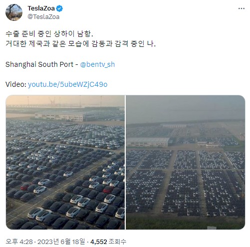 4. 캐나다 수출을 위한 테슬라 차량들이 상하이 남항에 대기 중인 모습입니다.