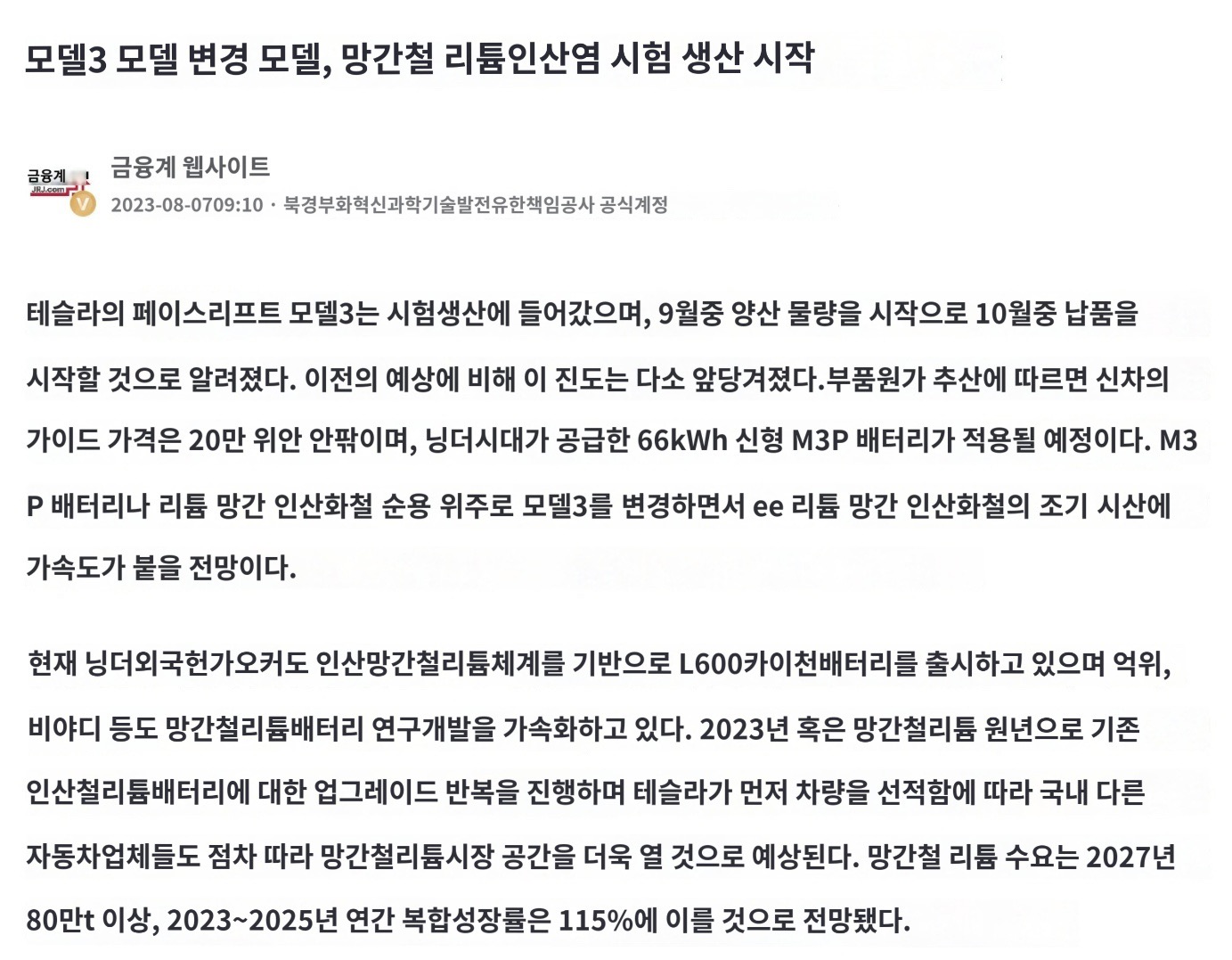 - 66kWh, 20만 위안, M3P 배터리