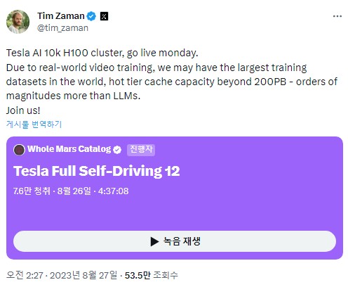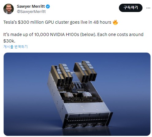 1. 테슬라 AI 및 오토파일럿 리더 Tim Zaman에 의하면, Tesla AI 10k H100 클러스터가 월요일에 출시될 예정입니다.