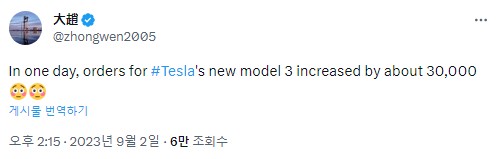 2. New 모델3가 발표된지 1루만에 중국에서만 3만건 주문했다는 소식이 있습니다.