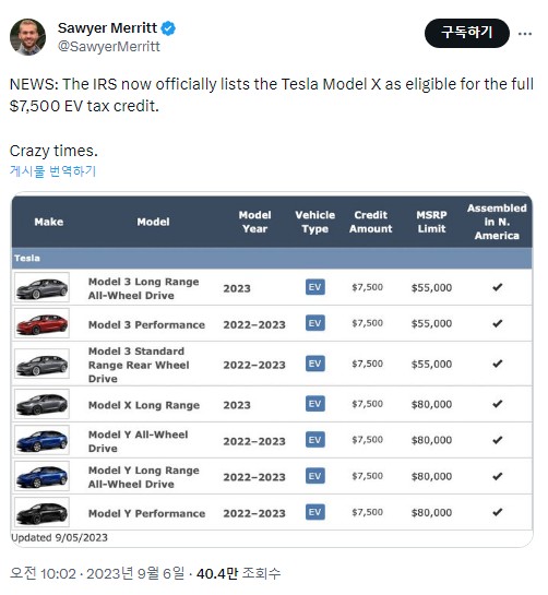 5. IRS가 이제 공식적으로 Tesla Model X를 $7,500의 EV 세금 공제 대상으로 등록했습니다.