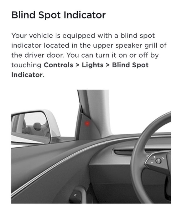 12. New Model3에 대한 'Blind spot indicator' 설명 추가됐습니다. 전체 설명서도 추가됐는데, 범퍼 카메라에 대한 언급은 없었습니다.