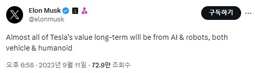 "테슬라의 장기적 가치 대부분은 인공지능 및 로봇에서 비롯될 것입니다. 이는 차량 및 인간형 로봇 모두에 해당합니다."