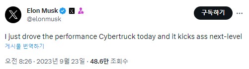 4. 일론이 오늘 한국 시간으로 오늘 8시 26분 경에 Cybertruck 퍼포먼스를 운전했는데 한 단계 더 발전했다고 말했습니다.