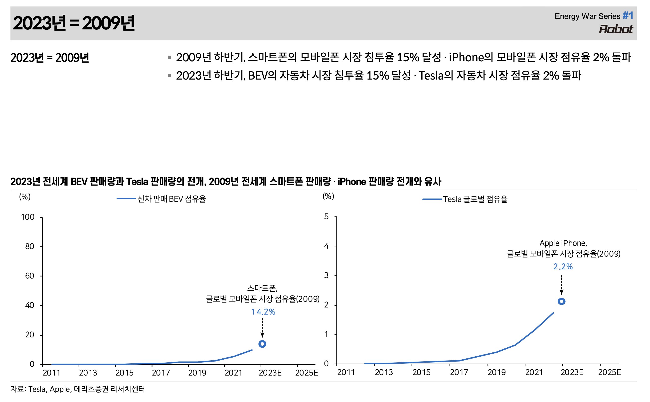 4. Robot War(메리츠 김준성 위원) 자료에 의하면, 현재의 2023년 테슬라는 2009년의 애플의 시장 점유율, 침투율과 유사한 흐름입니다.