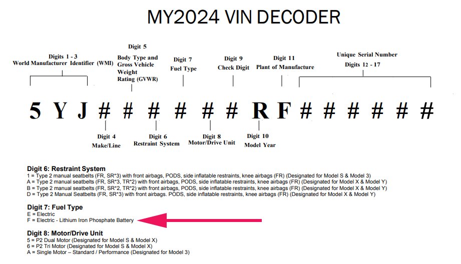 For the first time, Tesla VINs will soon start to show whether the car's battery is LFP or non-LFP Until now, the Vehicle Identification Number showed E in digit 7 for all Teslas. However, for 2024 model year VINs, digit 7 will show • E for non-LFP batte