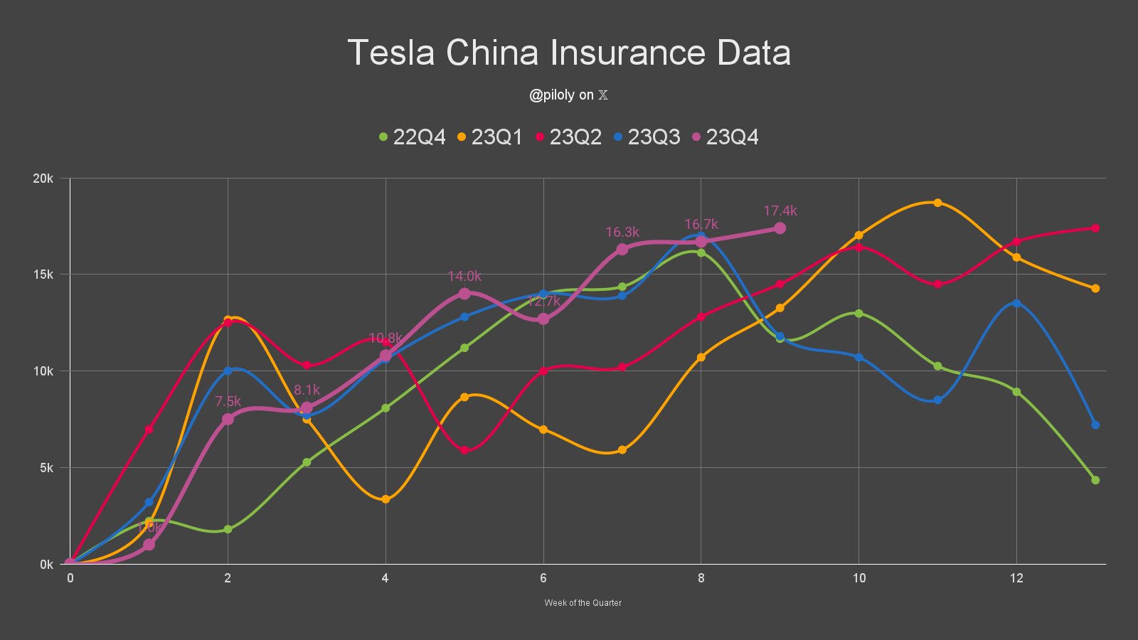 For the week of November 27-December 3, China reported 17.4k insurance registrations for @Tesla. 🇨🇳 That's +3% QoQ and +35% YoY. Highest 9th week of the quarter ever. Q4 best quarter ever so far.