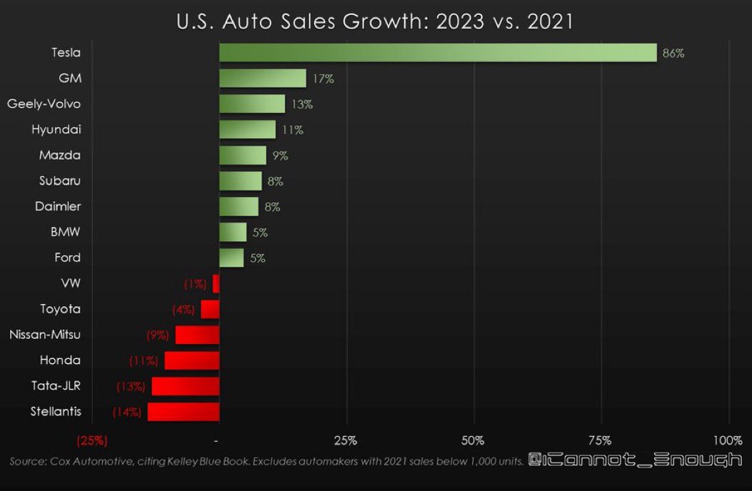 Over the past 2 years, Tesla grew its U.S. sales by a percentage 5x greater than the second-place competitor. 👀 $TSLA