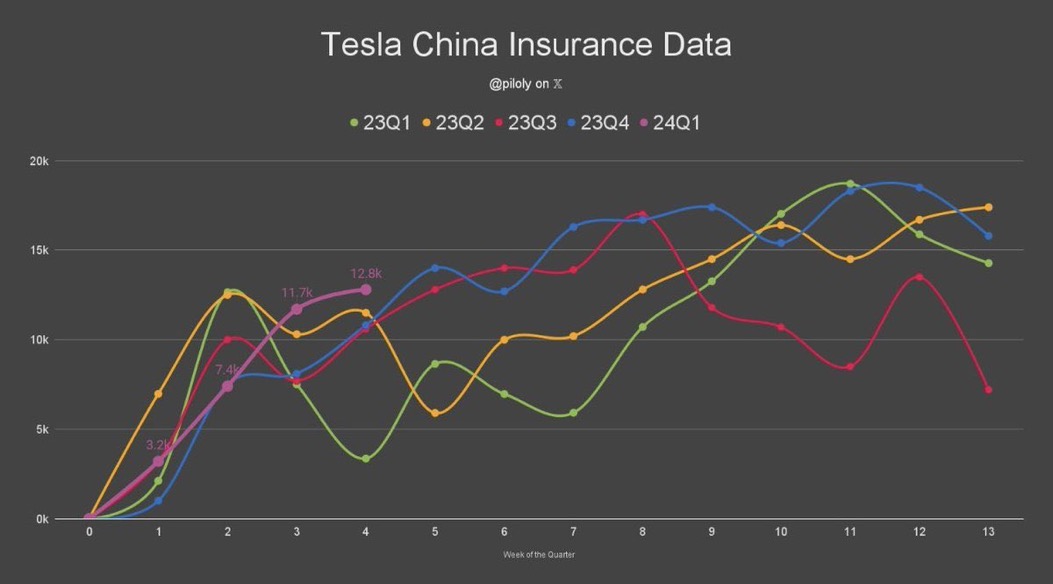 테슬라, 중국 🇨🇳 보험등록대수 1월 1-7일 : 3,200대 1월 8-14일 : 7,400대 1월 15-21일 : 11,700대 1월 22-28일 : 12,800대