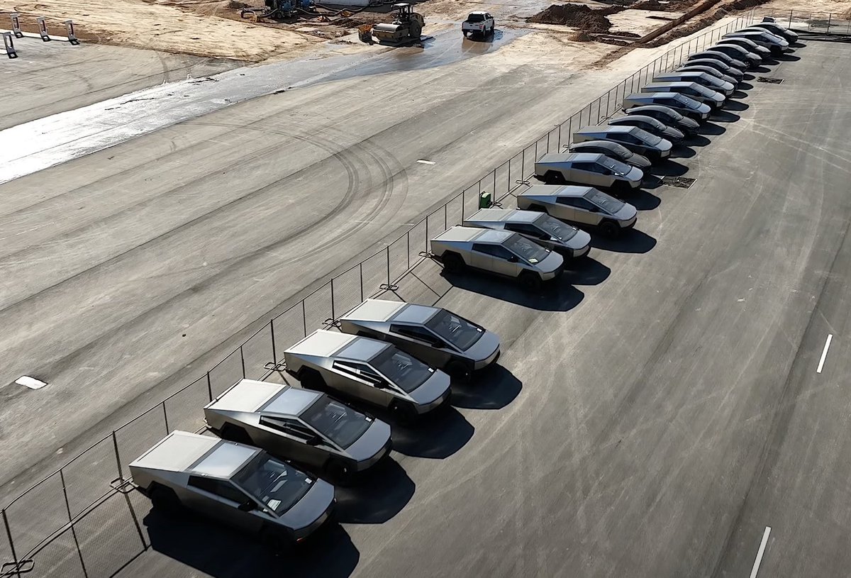Record 156 Cybertrucks spotted at Giga Texas today. Many at the outbound car carrier lot. Video by Brad Sloan: https://t.co/pBETxOKIxF