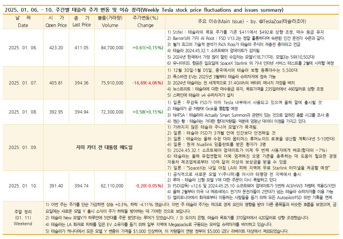 | 2025. 01. 13. - 17. 주간별 테슬라 주가 변동 및 이슈 정리 (6) | 2025.01.18 |