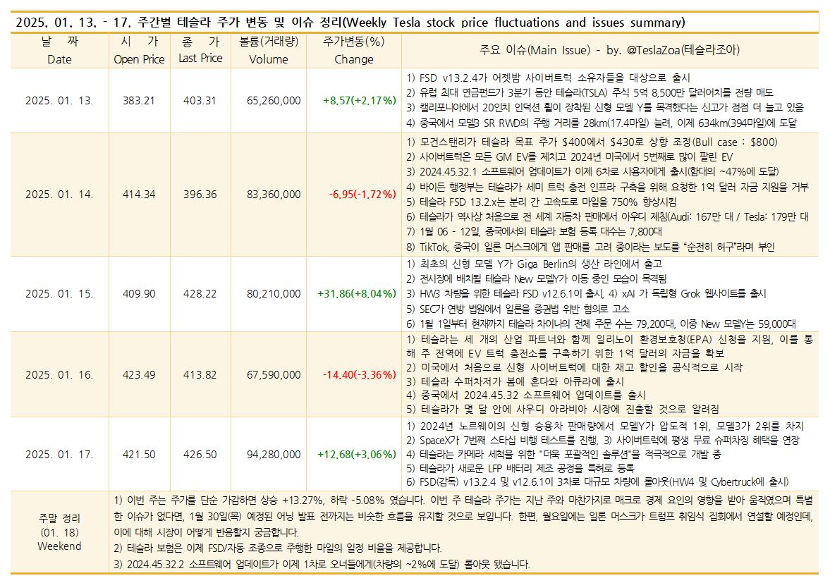 | 2025. 01. 20. - 25. 주간별 테슬라 주가 변동 및 이슈 정리 (5) | 2025.01.25 |