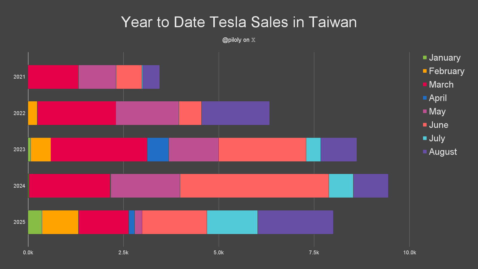 8. 대만에서 8월 테슬라는 1,977대를 판매하며 시장 점유율 6.7%를 기록, 브랜드 3위·모델Y는 전체 2위를 차지했습니다.