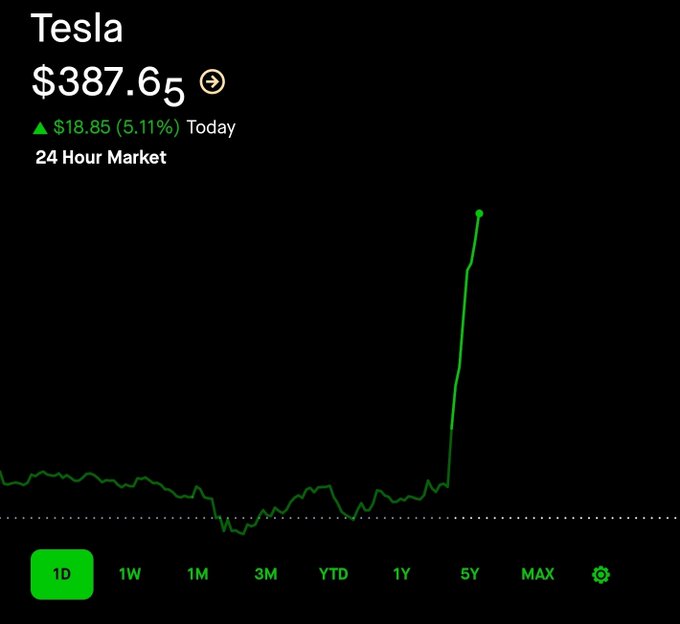 6. 공식 테슬라 AI 계정에서 아래의 테슬라 주가 상승의 이미지가 첨부된 글에 "무시하기 점점 더 어려워지고 있다."라는 답글을 남겼습니다.(이미지 포함)