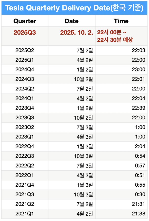 1. 2025Q3 테슬라 딜리버리 발표 예상 일시는 내일 10월 2일(목) 10:00-10:30(PM) 입니다.(이미지 포함)