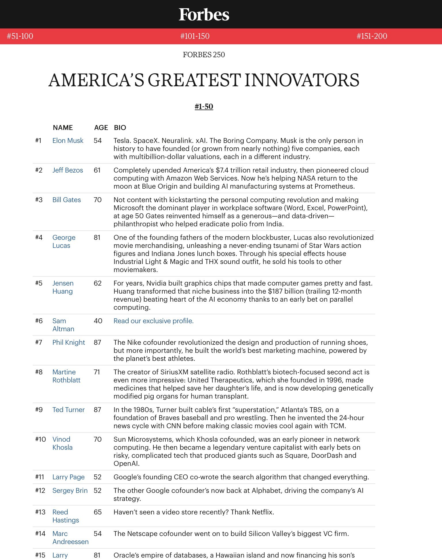 4. Elon Musk가 Forbes 선정 ‘미국 최고의 혁신가(America’s Greatest Innovators)’ 리스트에서 1위에 올랐습니다.
