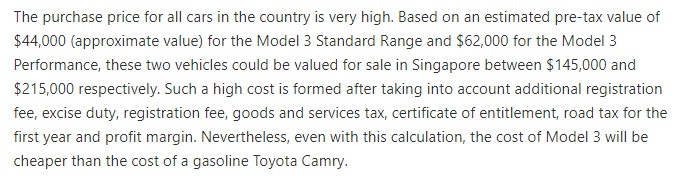 2. 테슬라가 싱가포르 시장 진출을 앞두고 있는데, 가격이 가솔린 토요타 캠리보다 저렴할 것으로 보입니다.
