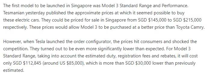 2. 싱가포르에서 모델3 스탠다드 레인지가 145,000 달러, 퍼포먼스는 215,000 달러(세전)에 판매 될 것으로 예상되었으나, 그보다 3만 달러 더 낮은 가격에 출시 되었습니다.