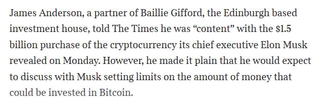 6. 베일리 기포드가 테슬라의 비트코인 투자(15억 달러 규모)에 대해 대체적으로 만족은 하지만, 투자 금액의 제한을 두는 것에 대해 논의가 필요하다고 언급했습니다.