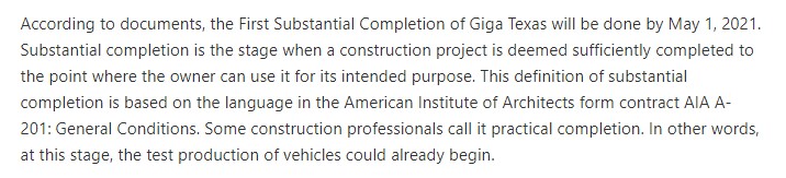 기가 텍사스는 2020년 7월 공사를 시작했고, 올해 5월 완공 예정입니다. 개인적으로는 공사 진행 속도가 너무 빨라 10개월 정도면 완공 후 바로 양산 시작할 것으로 생각했는데, 생산은 7월 정도 되어야 가능하지 않을까 생각됩니다.