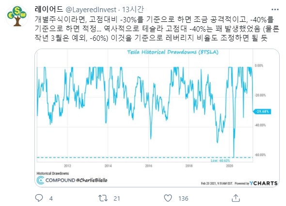 레이어드님이 어제 매수에 대한 좋은 내용 남겨 주셨던데, 고점 대비 -20-30% 의 가격대가 오면, 여유 자금이 있을 경우 추가 매수를 하는 것은 기본입니다. 같은 흐름에서, 캐시 우드도 고점 대비 테슬라 주가가 -30-40% 하락할 때 분할로 들어 간 것이겠죠.