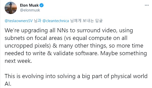 5. 머스크가 다음 주중에 NN(뉴럴 넷) 업그레이드가 있을 예정이라고 말했습니다.