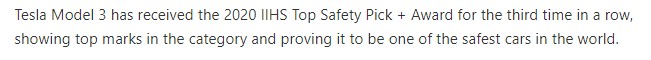 3. 모델3가 2020 IIHS Top Safety Pick + Award를 3회 연속 수상했고, 다시 한번 세계에서 가장 안전한 자동차 중 하나임을 증명했습니다.
