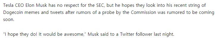 3. 트위터 @First Squawk 에 의해 머스크가 도지코인에 관련해서 SEC의 조사를 받을 수 있다는 소문이 처음 흘러 나왔습니다. 아직까지는 별다른 움직임이 없는데, 머스크는 오히려 조사를 받았으면 좋겠다고 풍자적 표현을 했습니다.