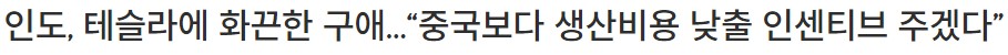 3. 인도정부는 '만약 인도에서 테슬라 차량을 생산하게 되면, 중국보다 제조비용이 적게 들것이라고 러브콜을 보냈다고 합니다.
