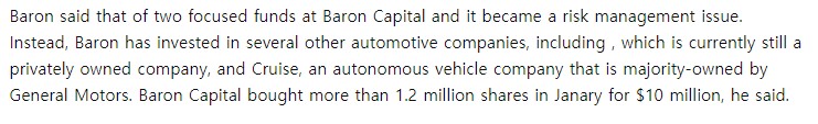 6. Baron 캐피털에서 6개월 동안 보유했던 테슬라 800만주 중 170만 주를 매각했다고 합니다.