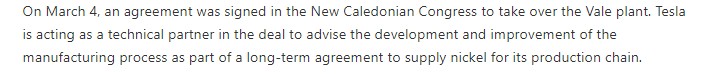 이는, 테슬라의 자사 생산 체인에 니켈을 공급하기 위한 장기 협정의 일환이라고 하며, 앞으로 테슬라는 제조 공정의 개발과 개선을 조언하는 기술 파트너 역할을 할 것이라고 합니다.