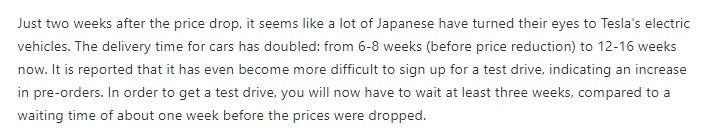 3. 테슬라 모델3의 일본 내 수요가 급증했다고 합니다.