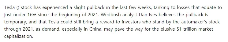 7. Wedbush의 댄 아이브스가 최근 테슬라의 주가 하락은 일시적인 것이며, 2021년까지 테슬라 주식을 고수하는 투자자들에게 반드시 보상이 있을 거라고 언급했습니다.