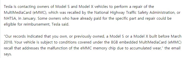 6. 테슬라에서 eMMC 리콜 수리를 위해 모델S와 X 오너들에게 연락할 예정이라고 합니다.
