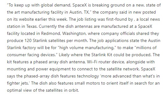 현재 위성 안테나 접시는 워싱턴 레이몬드에 위치한 스페이스x 시설에서 제조되고 있으며, 위성은 매달 120개 정도가 만들어지고 있습니다.