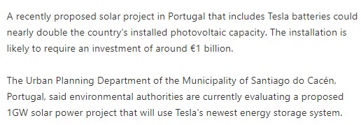 3. 포르투갈에 테슬라 배터리를 포함하는 태양열 프로젝트가 진행 중인데, 태양열 용량이 거의 두배로 늘어날 예정입니다.