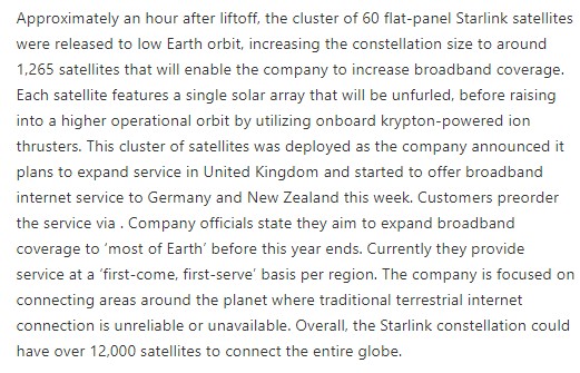 이로써, 약 1,265개의 위성이 되었습니다. 1400개 정도면 지구 전체를 커버할 수 있다고 알려져 있기 때문에, 3번정도의 발사 후에는 더 광범위한 위성 서비스를 하게 됩니다.