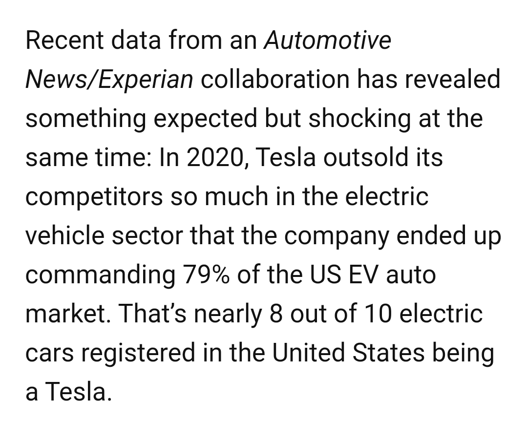 3. 2020년 미국의 EV 판매량에서 테슬라가 79%를 차지했습니다.